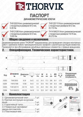 Динамометрические ключи THORVIK предназначены для проведения слесарно-монтажных работ с крепежом любого присоединительного профиля с различным крутящим моментом. Применяются при обслуживании резьбовых крепежных элементов с правым вращением.