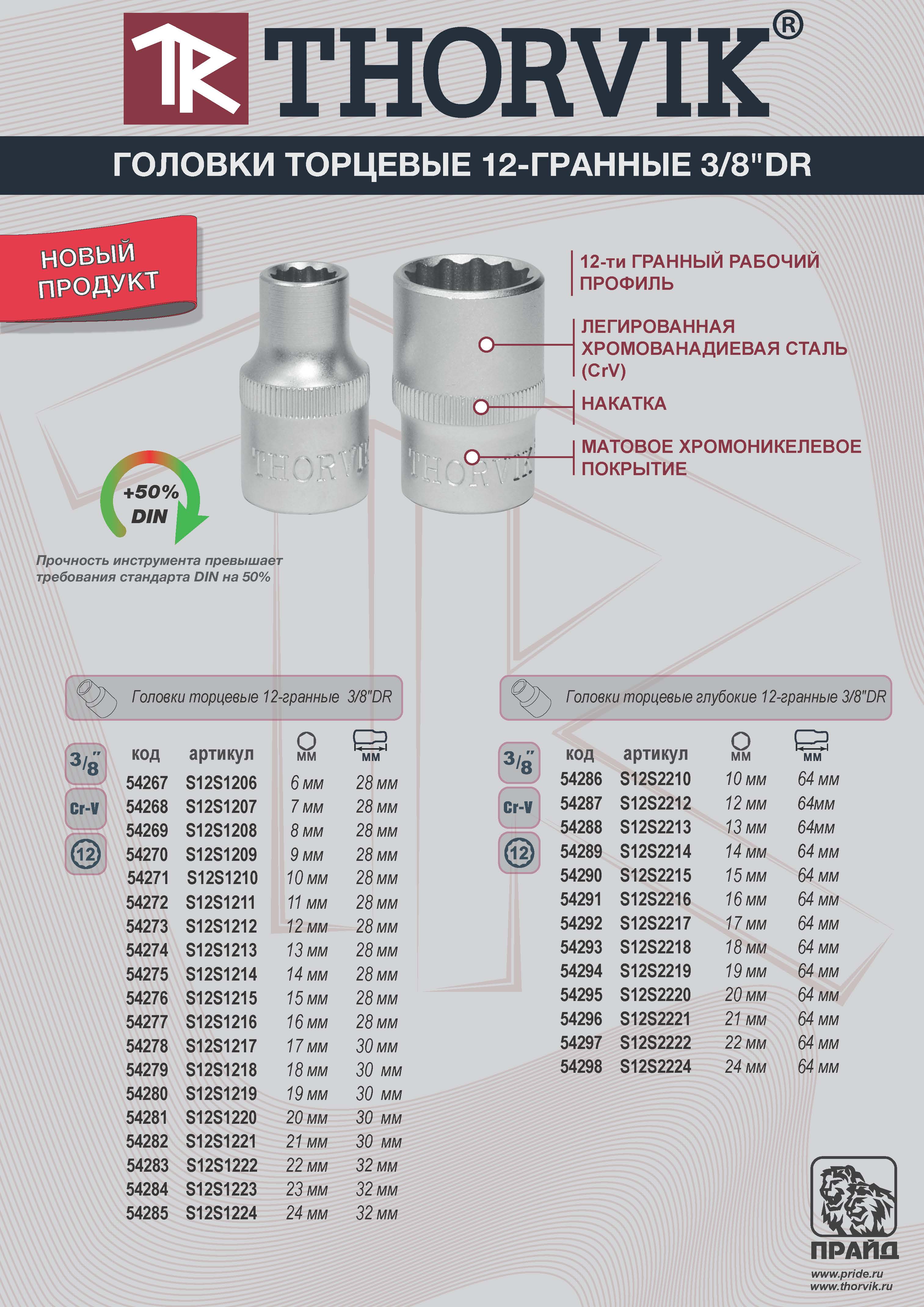 Торцевые головки Thorvik изготовлены с применением технологий, позволяющих передавать усилия, превышающие расчетные по современным стандартам на 30%. Широкий диапазон размеров, типов и профилей, высокая точность обработки, качественная хромованадиевая сталь и устойчивое хромоникелевое покрытие делают инструмент надежным и долговечным. Торцевые головки Thorvik являются основной для создания систем сборного слесарно-монтажного инструмента. Изделия производятся на современном оборудовании по стандарту DIN 3124, в соотвествии с ГОСТ 25604-83.