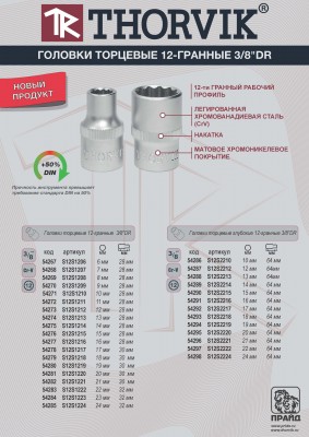 Торцевые головки Thorvik изготовлены с применением технологий, позволяющих передавать усилия, превышающие расчетные по современным стандартам на 30%. Широкий диапазон размеров, типов и профилей, высокая точность обработки, качественная хромованадиевая сталь и устойчивое хромоникелевое покрытие делают инструмент надежным и долговечным. Торцевые головки Thorvik являются основной для создания систем сборного слесарно-монтажного инструмента. Изделия производятся на современном оборудовании по стандарту DIN 3124, в соотвествии с ГОСТ 25604-83.
