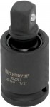 Шарнир карданный для ударного инструмента 1/2"DR Thorvik. Карданный шарнир - это дополнительная насадка, позволяющая, в определенных пределах, изменять направление оси приложения усилия за счет имеющихся двух степеней свободы конструкции изделия. Добавление шарнира в конструкцию инструмента заметно снижает ее прочность, что необходимо учитывать при работе с высоконагруженными и осложненными резьбовыми соединениями и стараться избегать применения карданных шарниров в этих случаях. Все изделия изготовлены из хромомолибденовой стали в соответствии со стандартом DIN 3121. Имеют покрытие - матовое фосфатирование.