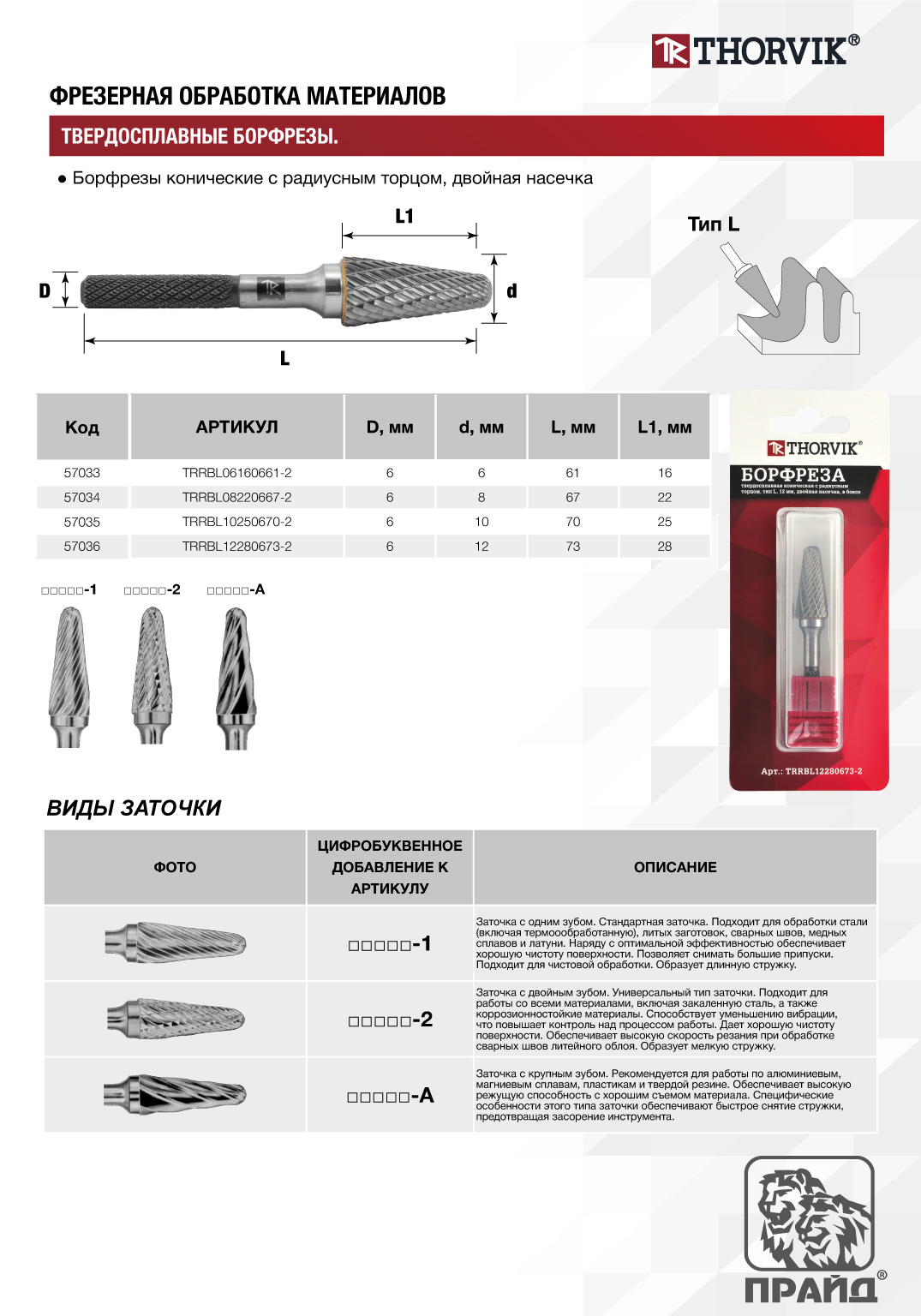 Борфреза твердосплавная коническая с радиусным торцом, тип L, 12 мм, двойная насечка, в боксе Thorvik. Универсальный тип заточки с двойным зубом. Подходит для работы со всеми материалами, включая закаленную сталь, а также коррозионностойкие материалы. Способствует уменьшению вибрации, что повышает контроль над процессом работы. Дает хорошую чистоту поверхности. Обеспечивает высокую скорость резания при обработке сварных швов литейного облоя. Образует мелкую стружку.